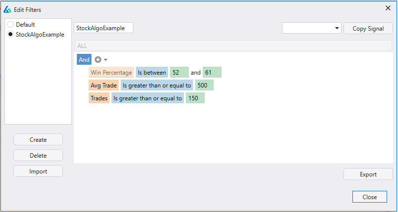 Step 3 – Filter Strategy Results Save time by having Build Alpha automatically discard strategies that do not meet your requirements. Set filters for performance metrics so that only acceptable algorithmic trading strategies are returned.