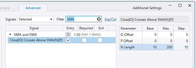 All signal lookbacks, thresholds, and values can be optimized. Parameter ranges can be customized and saved for each different signal. Build Alpha also has some popular signals hard-coded for quick use such as the 2-period RSI or 50-period simple moving average.