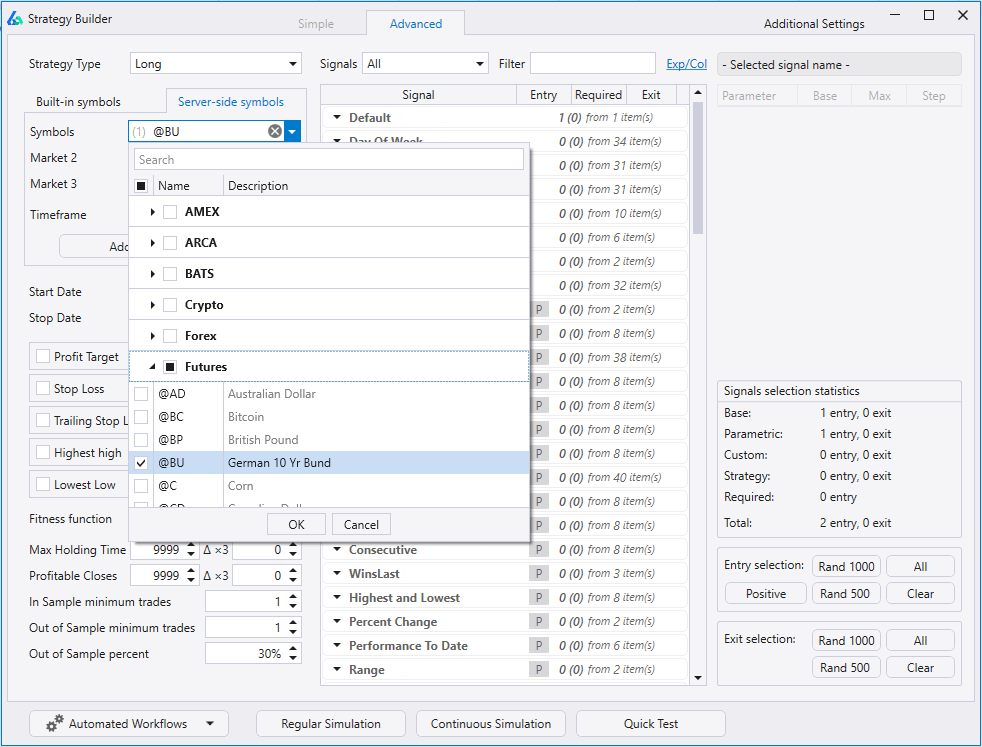 Step 1 – Symbol and Timeframe Selection Select the futures symbol or symbols you will build automated trading strategies for. Selecting a single symbol will return the best results for that symbol. Choosing multiple symbols and Build Alpha will return the best trading systems that work across that basket.