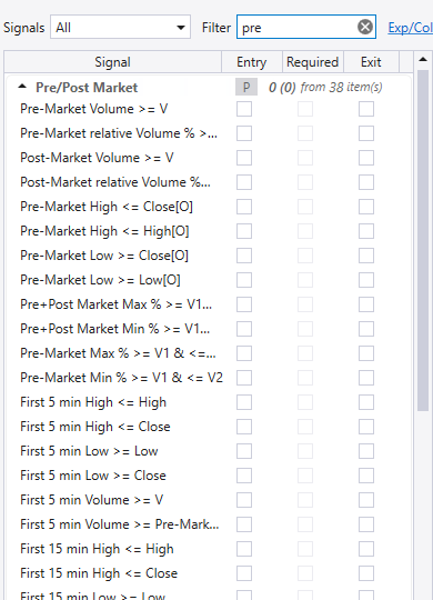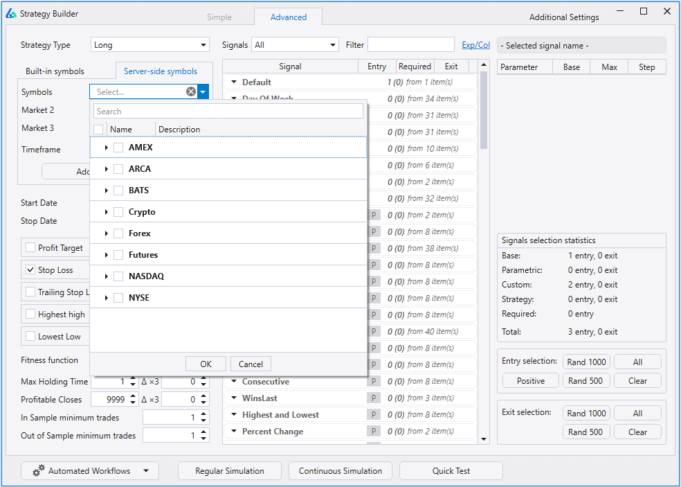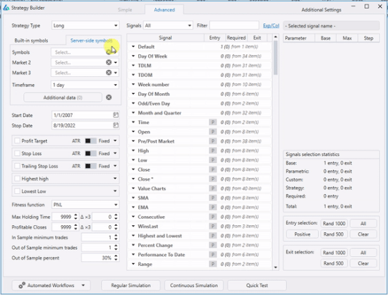 Step 2 – Choose your entry and exit signals. Build Alpha has 6,000+ entry and exit signals in the built-in library that cover just about everything you can think of for trading ideas. Here is a short list: