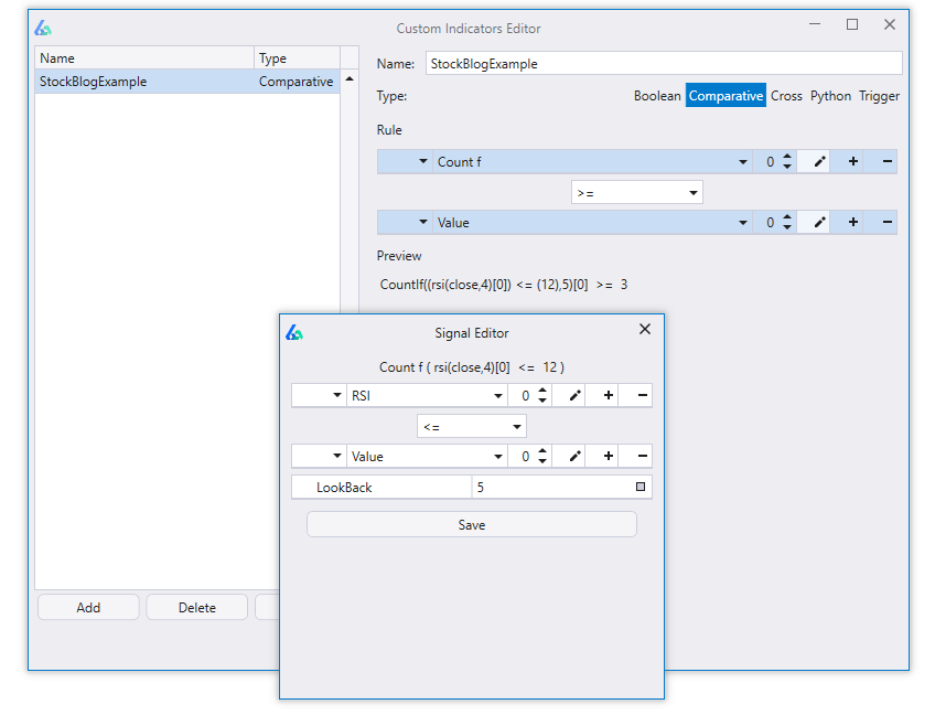 The first and easiest way, is to use the custom builder or signal editor which requires no coding at all. Simply choose whatever indicators, comparison, math operators and parameter values to create your custom signal.